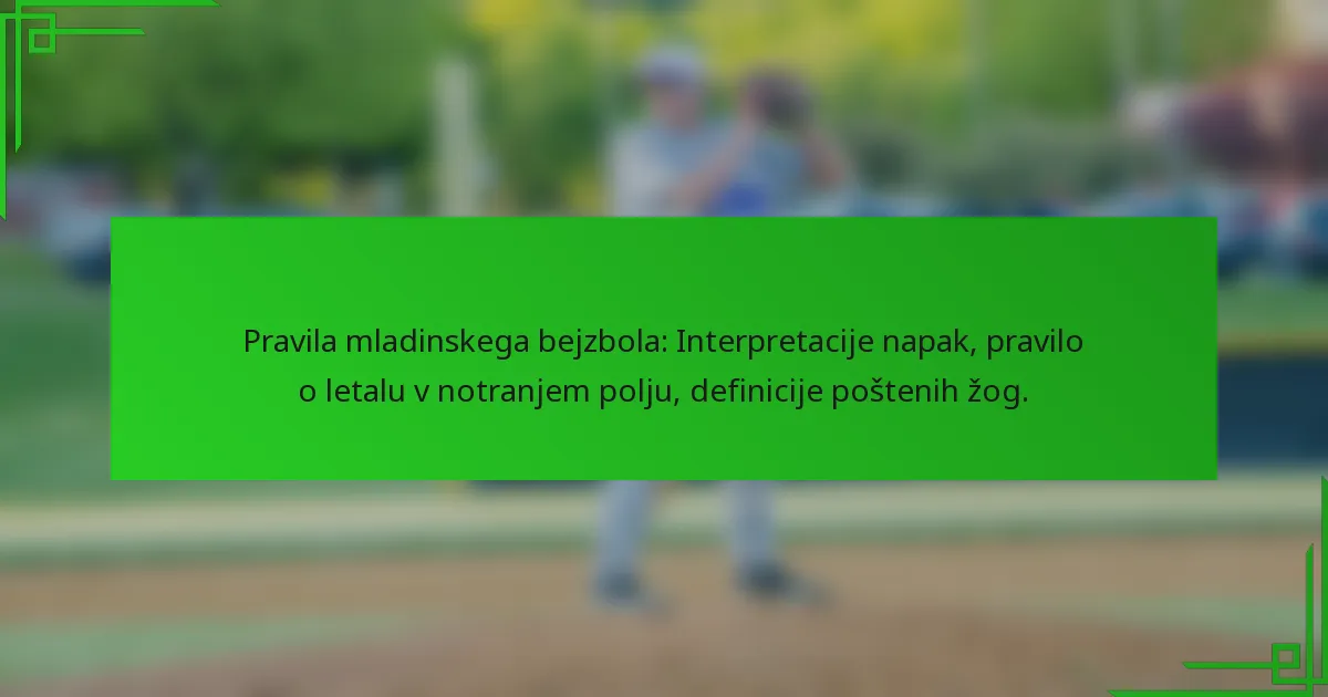 Baseball za mlade vključuje specifična pravila glede napak, pravilo o letih v notranjem polju in definicije poštenih žog, ki so ključnega pomena za integriteto igre. Napaka se zgodi, ko udarjena žoga pade zunaj poštenega območja, medtem ko pravilo o letih v notranjem polju ščiti tekače na bazah med določenimi pop-upi. Poleg tega je poštena žoga tista, ki pade v pošteno območje in ostane igrana, kar pomeni, da je za vse udeležence bistveno, da razumejo te interpretacije za nemoten potek igre.